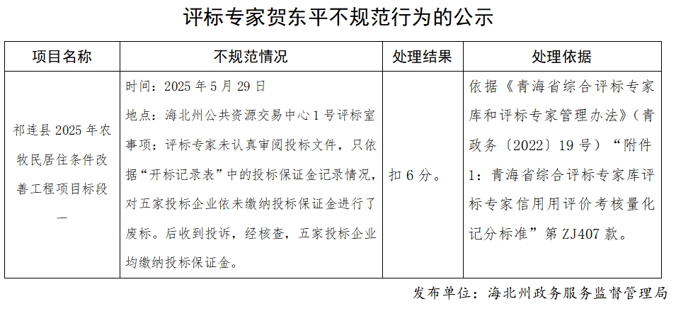 评标专家贺东平不规范行为的公示