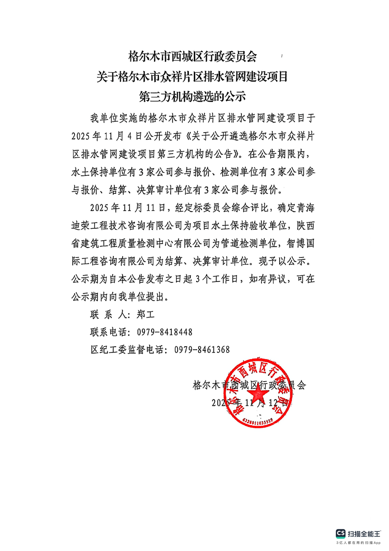 格尔木市西城区行政委员会关于格尔木市众祥片区排水管网建设项目第三方机构遴选的公示