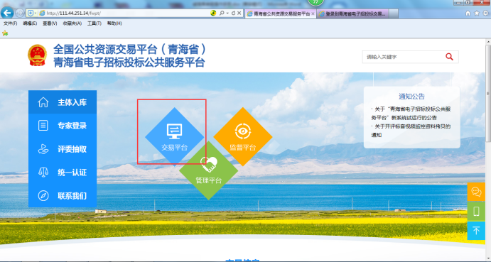 1、 首先进入青海省电子招标投标公共服务平台:http://111.44.251.34/fwpt/进入电子交易平台,点击交易平台进入