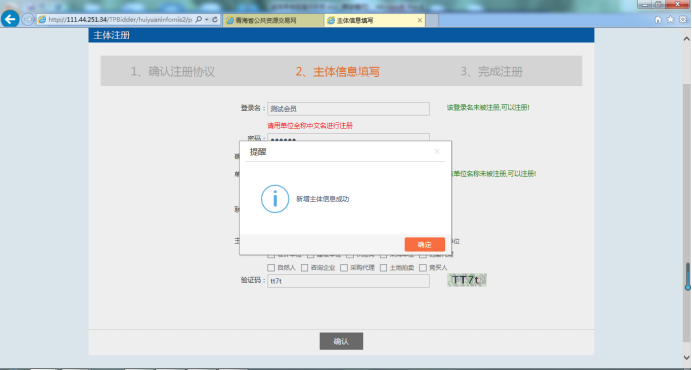 填写完成后提交信息,显示新增企业会员成功,点击确定按钮后: