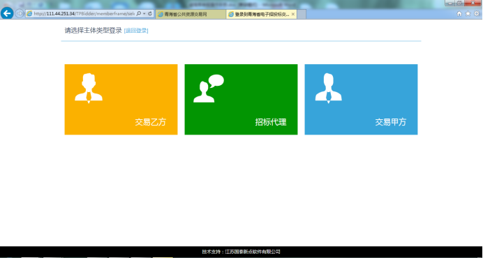 1、首次注册之后,就进入到信息的完善页面;如下图所示,选择登录的身份,下面以招标代理身份为例进行说明;