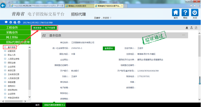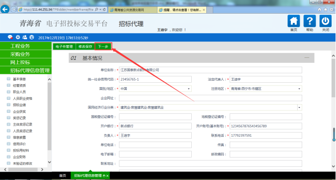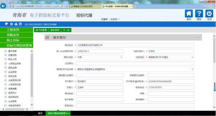 显示输入的企业信息,确认无误后点击确认按钮,进入企业会员端系统:该页面显示所有企业在注册时选中的会员类型列表。以招标代理身份为例。