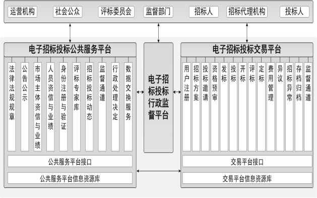 交易平台是以数据电文形式完成招标投标交易活动的信息平台。公共服务平台是满足交易平台之间信息交换、资源共享需要,并为市场主体、行政监督部门和社会公众提供信息服务的信息平台。行政监督平台是行政监督部门和监察机关在线监督电子招标投标活动的信息平台。