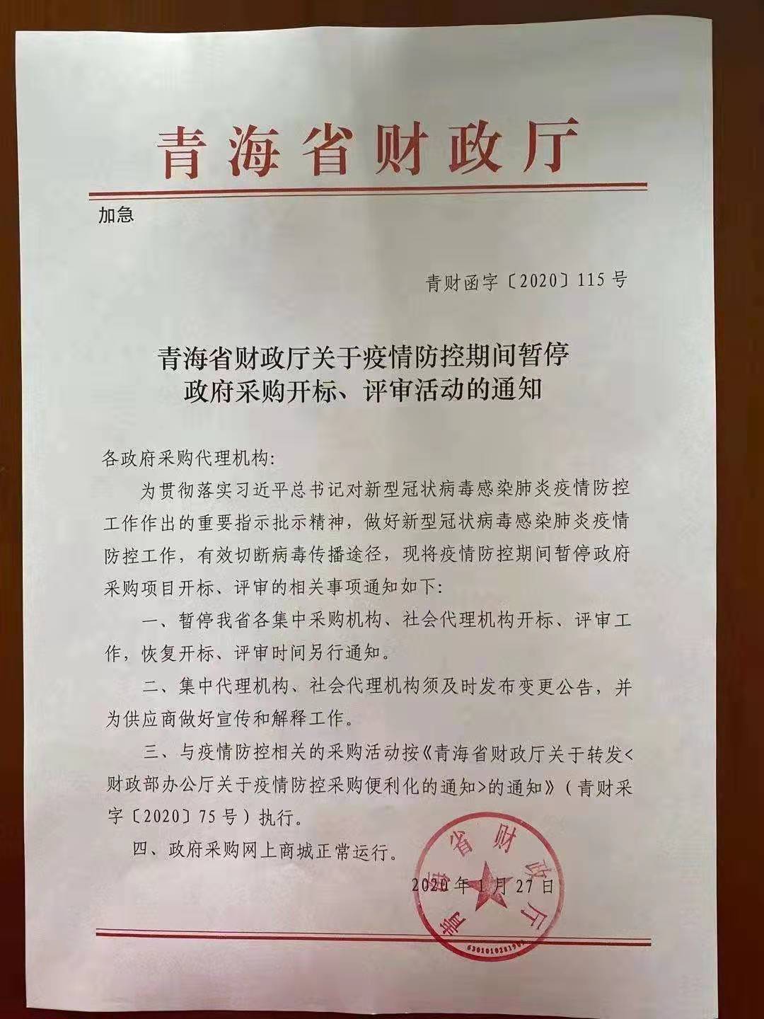 海北州政务服务监督管理局转发关于青海省财政厅疫情防控期间暂停政府采购开标、评标活动的通知