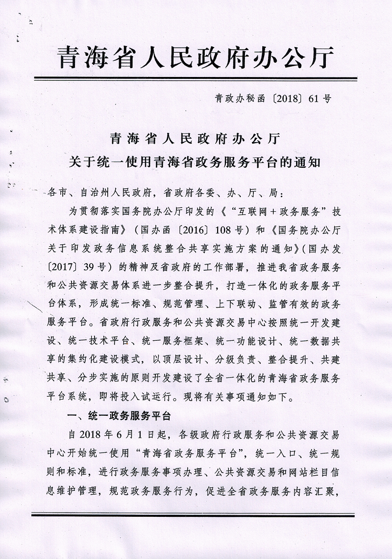 关于统一使用青海省政务服务平台实行全流程电子化交易的通知