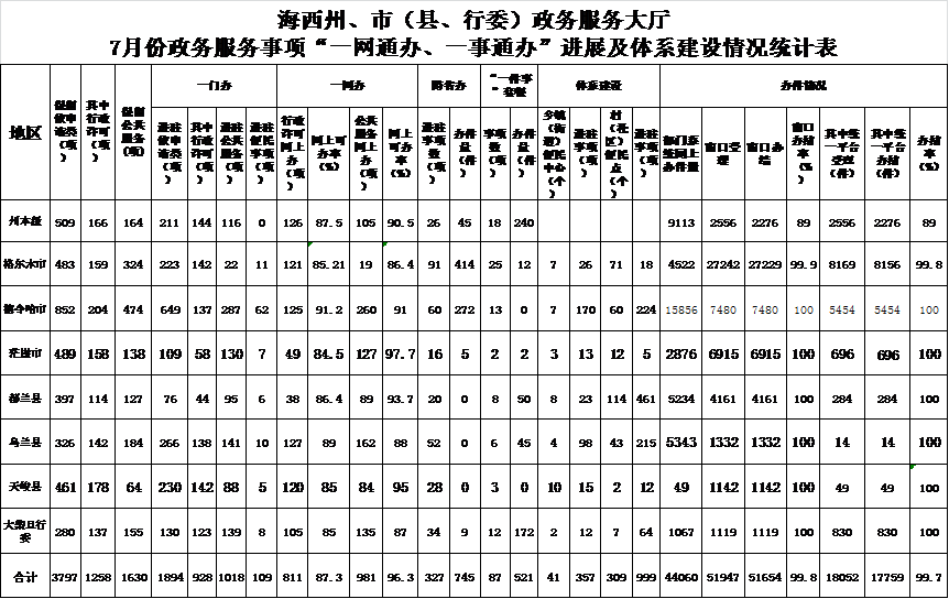 2.海西州、市(县、行委)政务服务大厅7月份政务服务事项“一网通办、一事通办”进展及办件情况统计表
