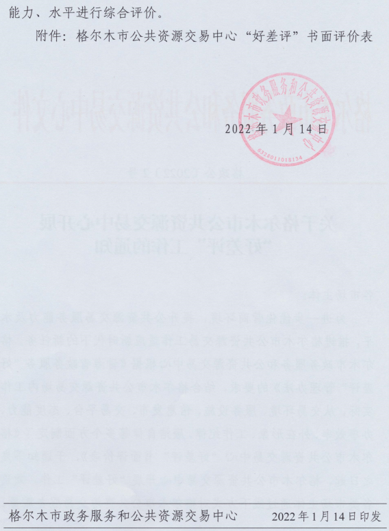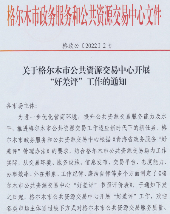 关于格尔木市公共资源交易中心开展“好差评”工作的通知