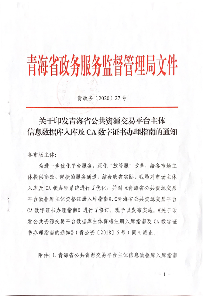 关于印发青海省公共资源交易平台主体信息数据库入库及CA数字证书办理指南的通知