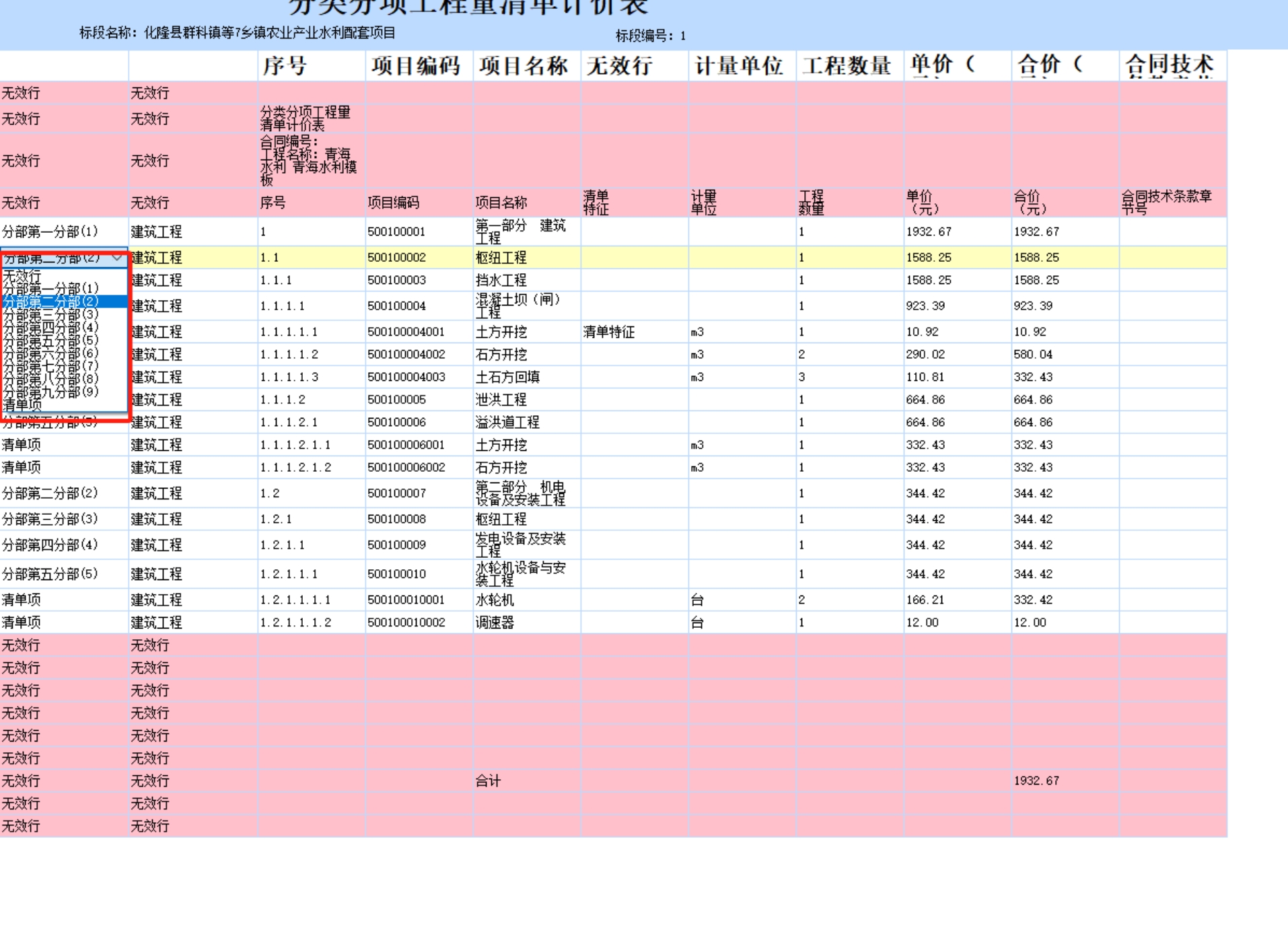 4. 分类分项报表导入时需要选择清单,分部层级关系