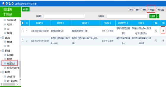 8.在专家费用发放页面,选择左上角的“审核通过”,点击相对应项目后面的打印按钮进行专家费用发放表的打印。