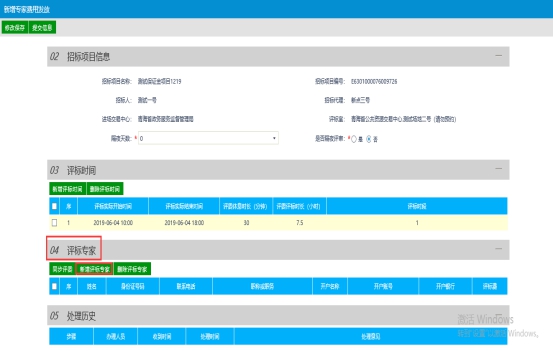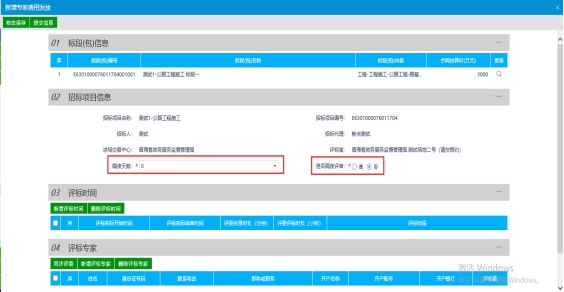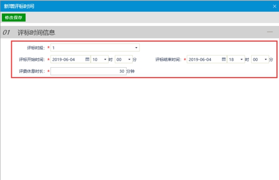 4.在03评标时间,点击新增评标时间,进入新增评标时间页面,填写评标时间信息,填写完成后点击修改保存。