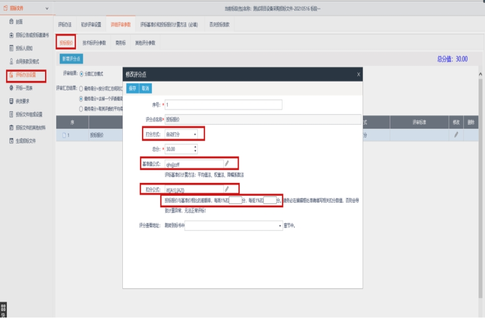 设置评标办法时,含有“投标报价”评分点的,需要设置打分方式。 打分方式设置为“自动打分”的需要选择基准值公式及扣分公式,并填写相关参数,请仔细查看各公示的备注信息,选择适当扣分公式。否则系统将无法自动算分。打分方式设置为“直接打分”的则评标过程中系统将不进行自动算分,需评委手动算分后,输入得分。