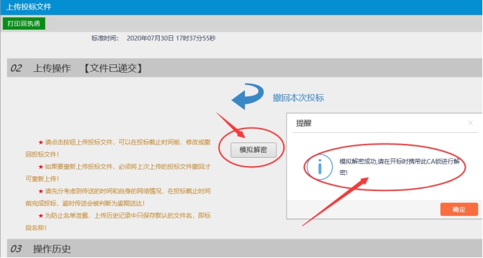 四、检查投标文件状态为“文件已递交”,点击“模拟解密”按钮(此时CA数字证书是插入状态),按照提示输入CA数字证书密码后点击确认,等待弹出结果提示: