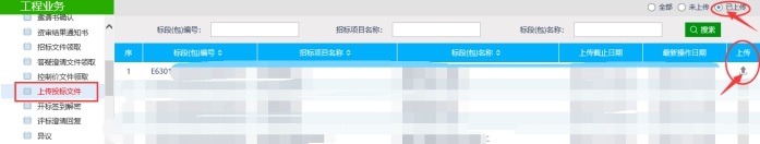 三、选择工程业务—“上传投标文件”菜单,右上角选择“已上传”,找到需模拟解密的项目,点击“上传”按钮上传该项目投标文件。