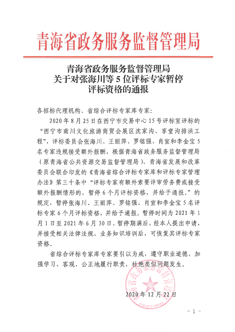 青海省政务服务监督管理局关于对张海川等5位评标专家暂停评标资格的通报