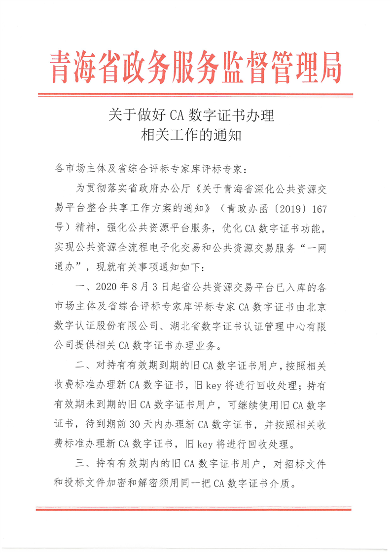 关于做好CA数字证书办理相关工作的通知
