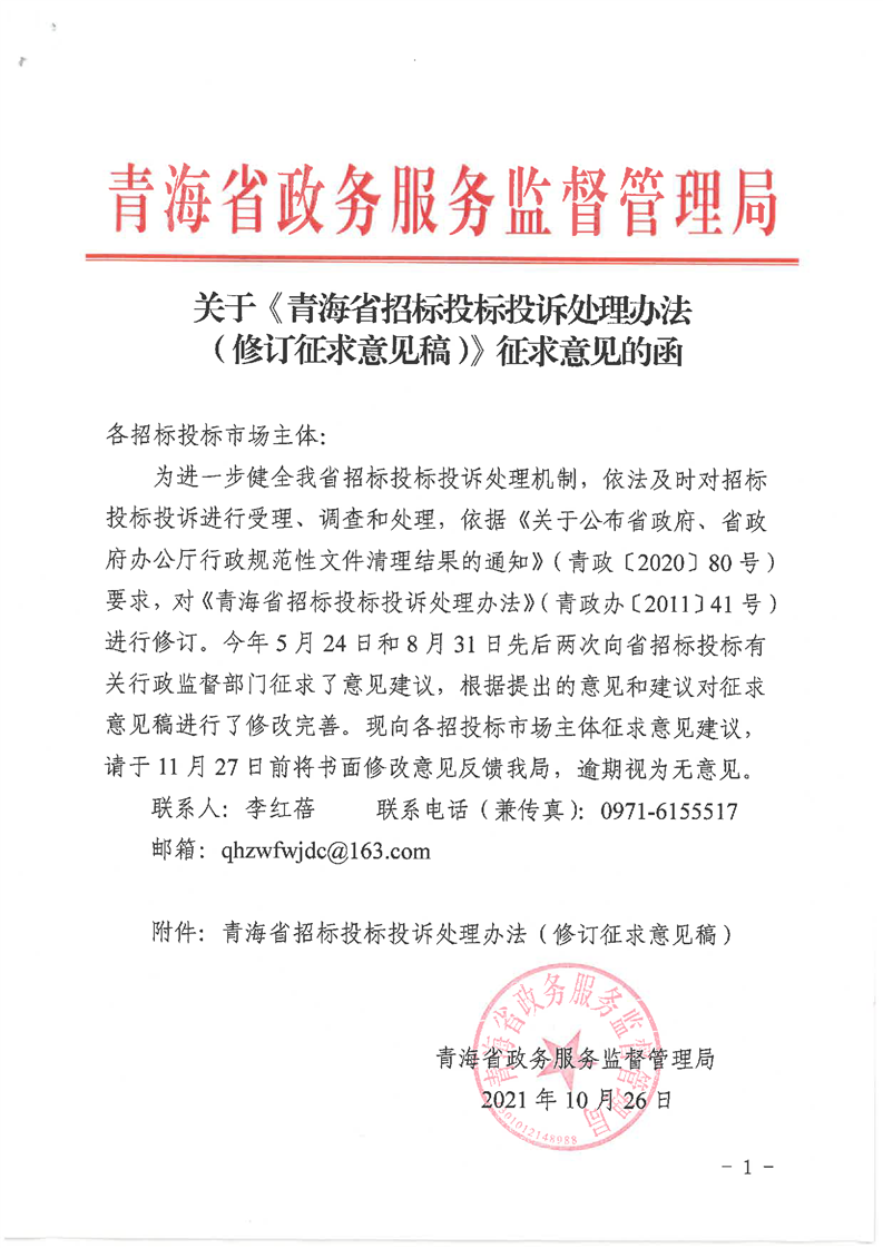 关于《青海省招标投标投诉处理办法(修订征求意见稿)》征求意见的函