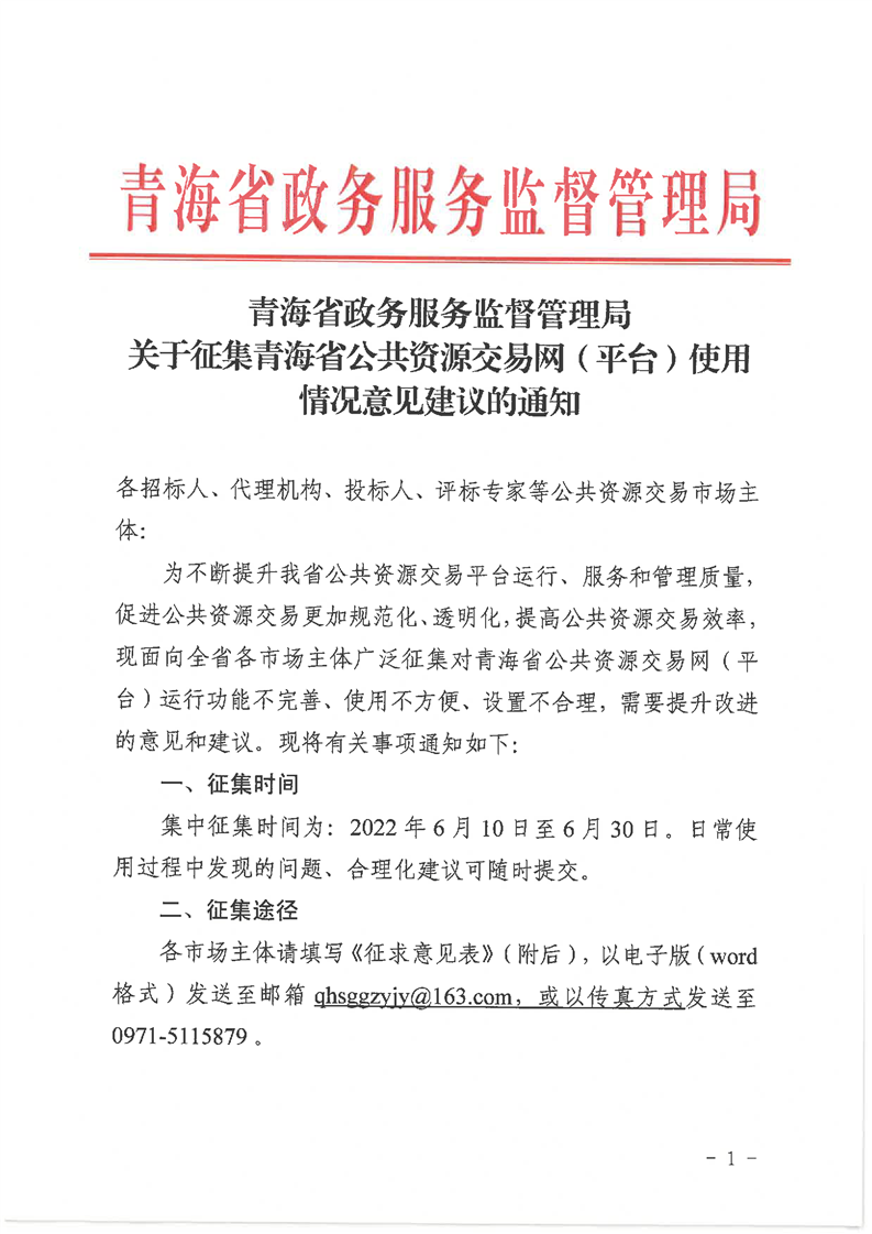 关于征集青海省公共资源交易网(平台)使用情况意见建议的通知