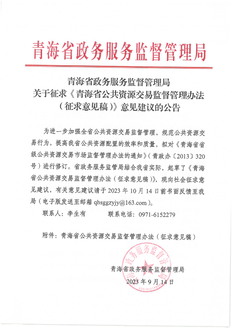 关于征求《青海省公共资源交易监督管理办法(征求意见稿)》意见建议的公告