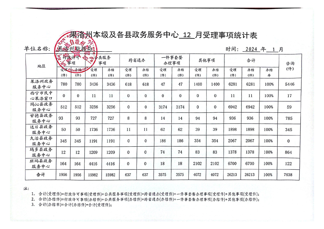 2024年12月份果洛州公共资源交易和政务服务办件情况