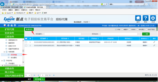 1、招标人、招标代理机构登录青海省电子招投标交易平台后,在【工程业务】--【专家抽取】菜单下点击【项目新建】,点击页面上的【新建项目】进入挑选项目页面。
