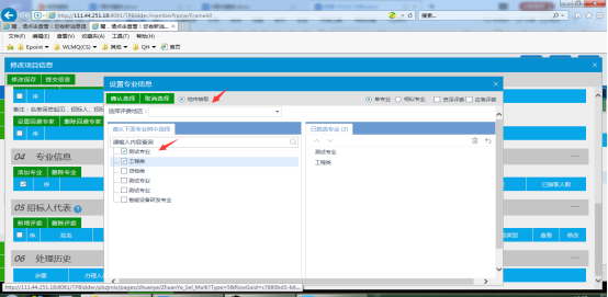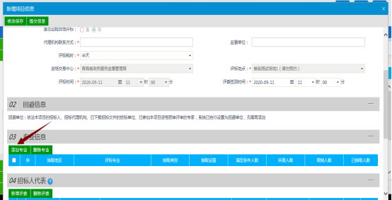点击03专业信息部分下的【添加专业】按钮挑选所需的评标专业、评标专家所属地区。