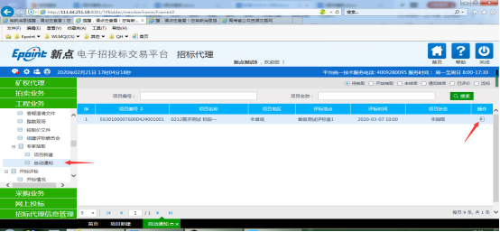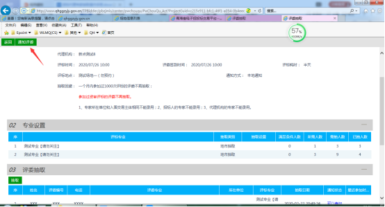 在【工程业务】--【专家抽取】菜单下点击【自动通知】点击相应项目后的【操作】按钮进入抽取通知页面。