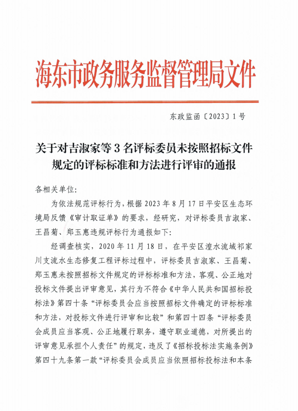 关于对吉淑家等3名评标委员未按照招标文件规定的评标标准和方法进行评审的通报