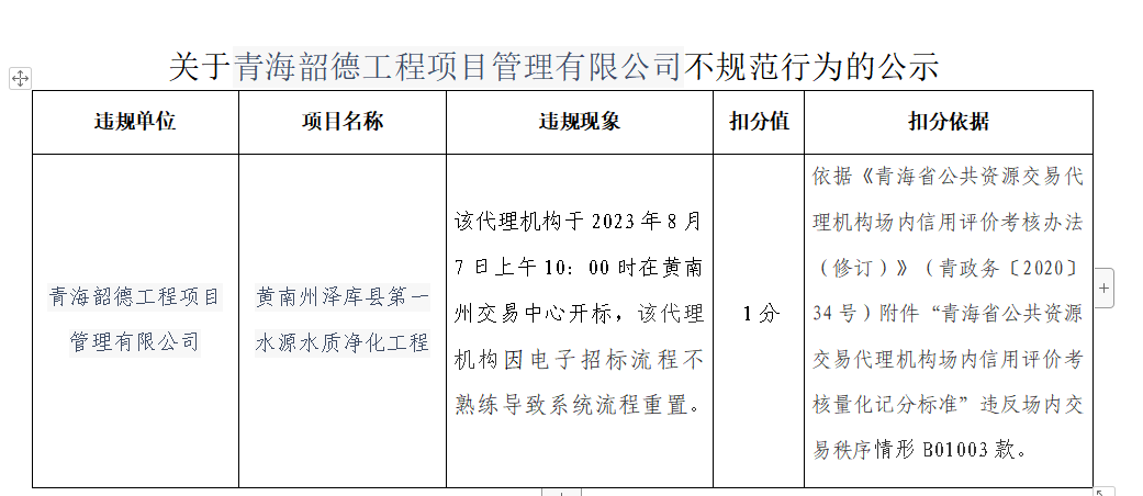 关于青海韶德工程项目管理有限公司不规范行为的公示