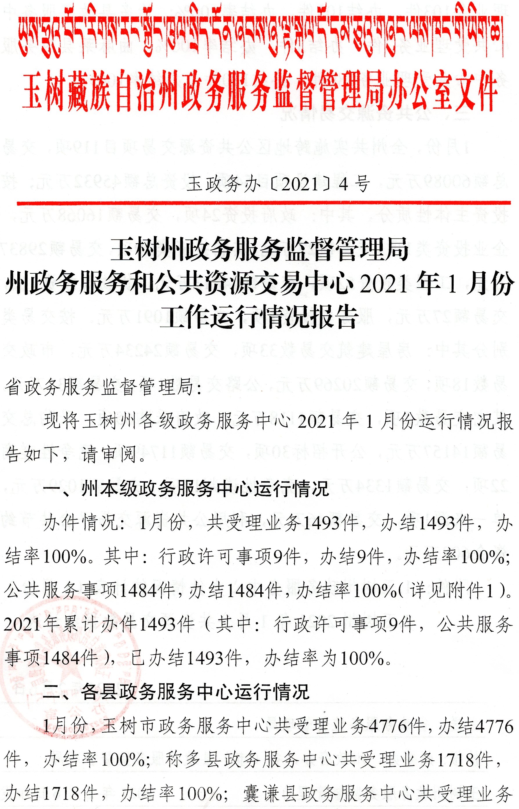 玉树州政务服务监督管理局政务服务和公共资源交易中心2021年元月份工作运行情况报告