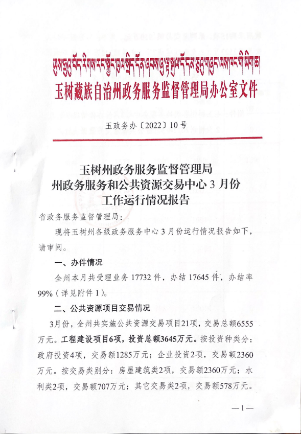 玉树州政务服务监督管理局政务服务中心和公共资源交易中心3月份工作运行情况报告